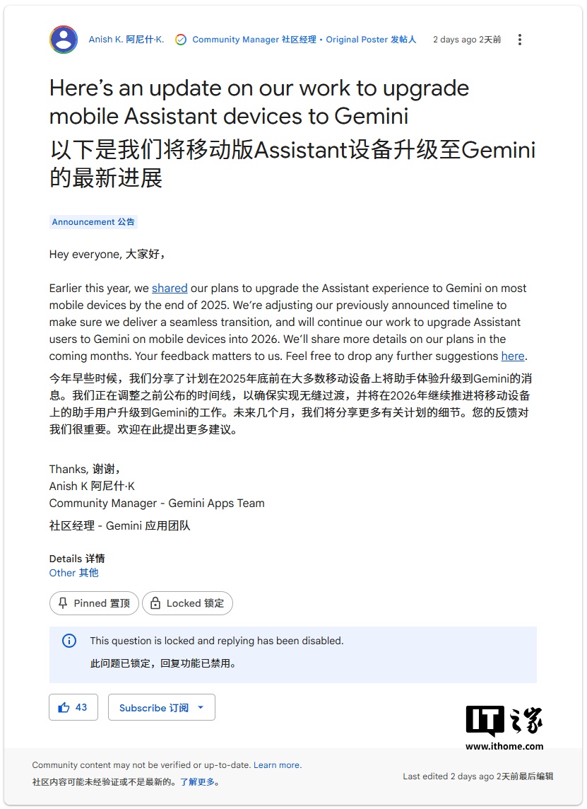 谷歌表示,调整此前公布的时间线,是为了“确保实现无缝过渡”,安卓设备上谷歌 Assistant 向 Gemini 的迁移更新工作,将持续至明年。该公司还称,会在“未来数月”公布更多细节。